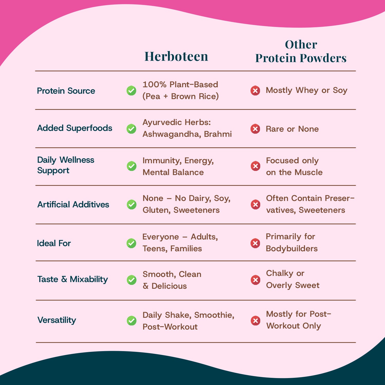 Powerful 100 % Plant-Based Protein for Active Lifestyles Fuel your body with Herboteen, a scientifically formulated plant-based protein powder infused with herbal superfoods. Herboteen has been meticulously formulated by logical & harmonious integration of ancient botanical wisdom with modern science making it evidently, efficacious, effective & reliable product.
